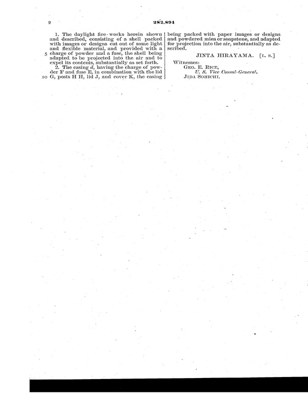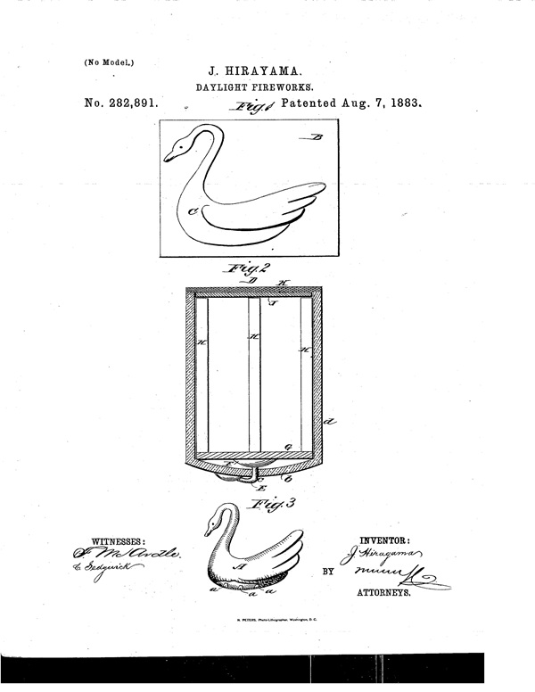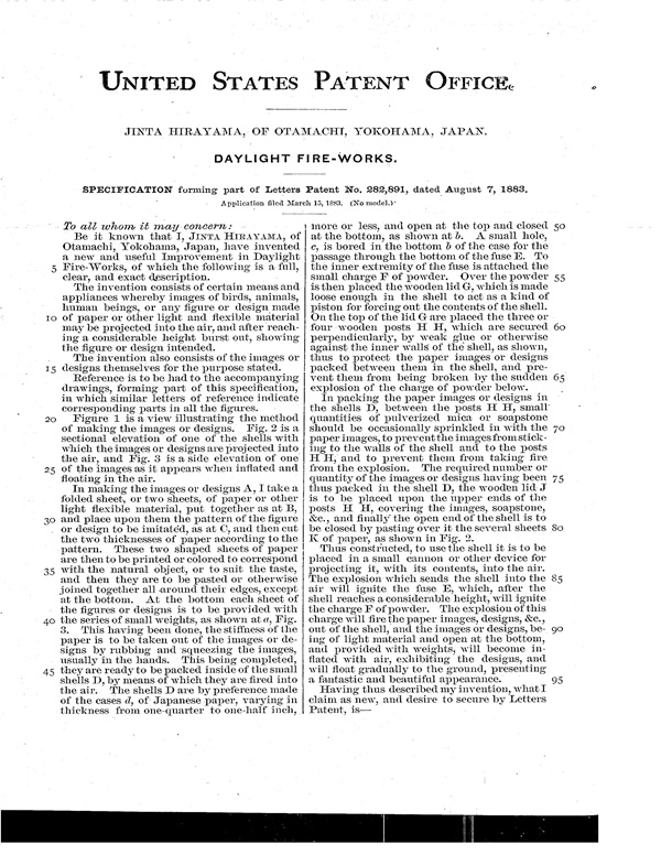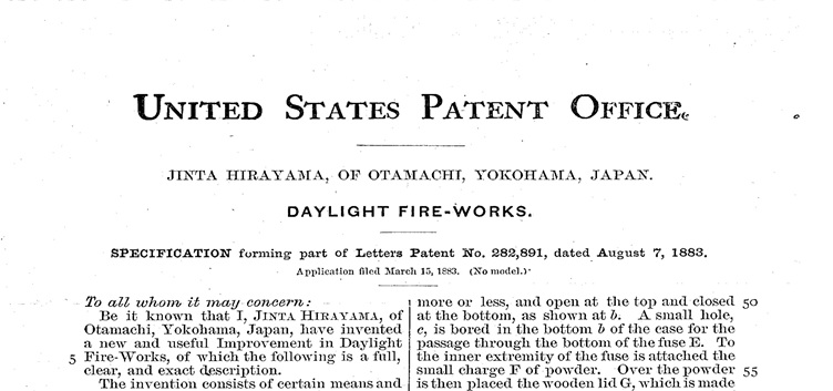 发明人:平山仁太。发明名称:Daylight Fire-works(白天烟花)。专利号:282,891。专利注册日期:1883年8月7日。